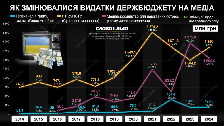 Різке зростання видатків на цю бюджетну програму було у 2022 році – 407,4 млн гривень (+380,6%). Це було пов’язано із перезапуском та оновленням парламентського телеканалу.