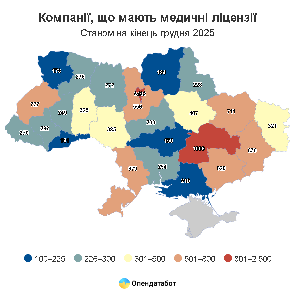 Ще 14 325 ліцензій належить компаніям. Майже половина компаній з чинними ліцензіями МОЗ зосереджені у п’яти регіонах: Києві — 2 493 або кожна п’ята установа у країні, Дніпропетровщині (1 006), Львівщині (727), Харківщині (711) та Одещині (679).