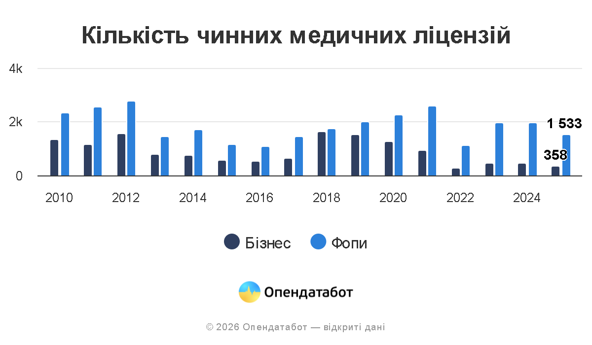 За даними Міністерства охорони здоров’я, майже 44 тисячі дійсних медичних ліцензій наразі нараховується в Україні. 67% ліцензій видано лікарям та медичним фахівцям, які оформлені як фізичні особи-підприємці. Найбільш активно ФОПи отримують ліцензію стоматологів.