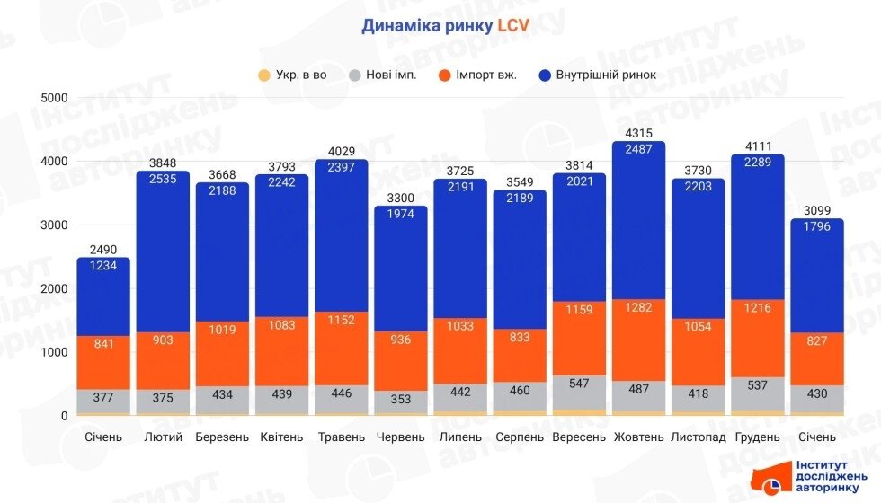 За перший місяць року на внутрішньому ринку укладено 1796 угод купівлі-продажу LCV. Ще 827 автомобілів вперше зареєстрували після імпорту, а 476 машин отримали перші номерні знаки як нові. Із них 46 одиниць були виготовлені або переобладнані в Україні.