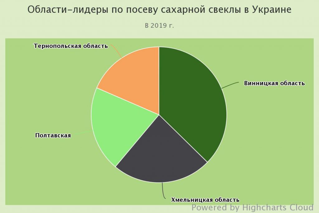 В 2019 г. , как и в 2018 г., больше половины посевов сахарной свеклы аграрии засеяли в четырех областях: Винницкая — (21,8%), Хмельницкая — (13,9%), Полтавская — (11,9%), Тернопольская — (10,8%).