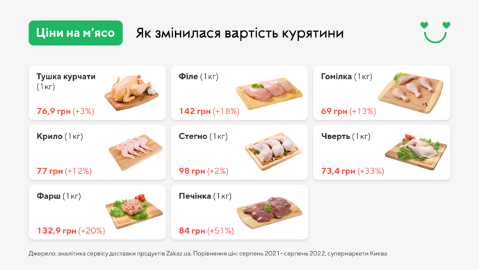 Стоимость свежего куриного филе за год в украинских супермаркетах выросла на 18%. В августе 2021 г. цена на полках ритейлеров в среднем составляла 120 грн/кг, тогда как в этом году она подскочила до 142 грн/кг.